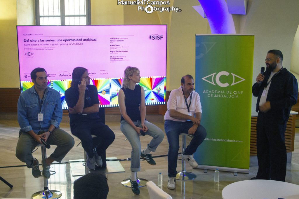 La charla “Del cine a las series: una oportunidad andaluza” reunió a figuras destacadas del sector audiovisual como Alfonso Sánchez, Rafa Cobos e Ingrid García-Jonsson, en un encuentro moderado por Enrique Iznaola, vicepresidente de la Academia de Cine de Andalucía.