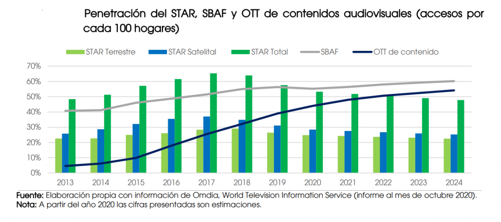 Según el Estudio de Diagnóstico del Servicio de Televisión y Audio Restringidos en México del Instituto Federal de Telecomunicaciones (IFT) de México, pese a la diversificación del consumo de contenidos audiovisuales en internet, la TV de pago mantiene su relevancia en términos económicos, consiguiendo unos ingresos de 2.365 millones € y unos 20,2 millones de subscriptores. Una cifra que supone una penetración del 58% de los hogares mexicanos.