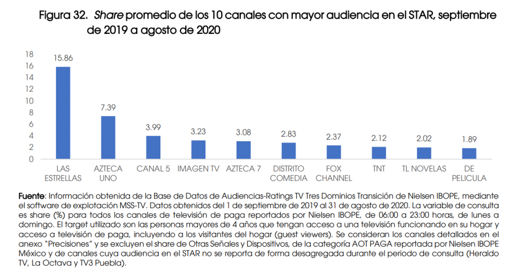 Respecto a las cadenas televisivas, Televisa continúa siendo el grupo dominante, con 57,79% de audiencia total, mientras que TV Azteca suma un 31,70%, Imagen TV un 6,35% y Multimedios un 3,85%. Y en lo que respecta a las opciones por tipología de contenidos, un solo proveedor de contenidos concentra más del 40% de la audiencia de cada categoría: Televisa en TV Abierta, entretenimiento y programas musicales; Disney en programación infantil; Discovery en Factual; Fox en Deportes; y Megacable en programas informativos